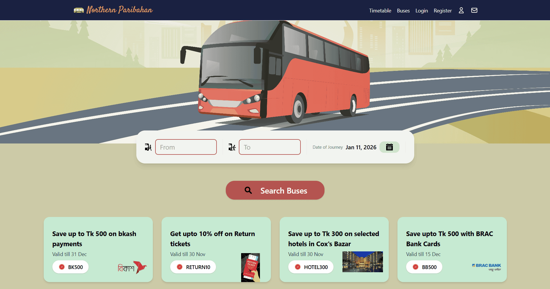 Seamless ticket booking with real-time seat availability & instant ticket confirmation • Users with personalized travel history, route & account management • Bus & timetable seeding realtime from Socket.io • Supabase for authentication & user management • Robust Admin Control for managing routes, schedules, fares & users. • SSLCommerz checkout for secure transactions, Mail & PDF ticket delivery.